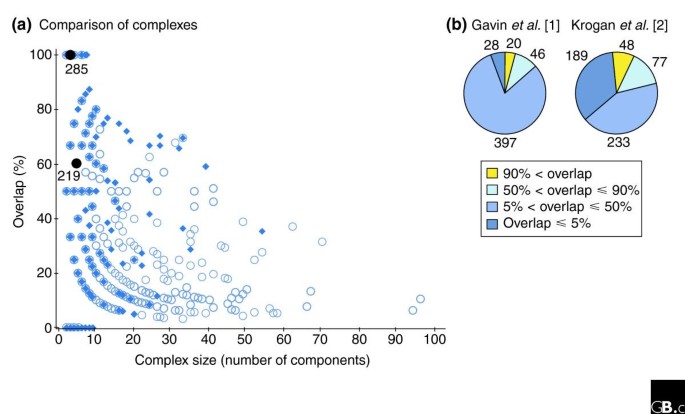 核心成果提炼:首次定义了酵母蛋白质复合物的“核心-模块-附件”功能结构,揭示了不同实验方法与数据处理策略对复合物鉴定的显著影响,为系统生物学中功能模块的研究提供了范式;创新性在于首次系统对比了两项最全面的酵母复合物数据集,明确了技术方法对结果的调控作用;统计学结果显示,Gavin等的重复实验中69%的蛋白质重复出现(n=139,文献未提供P值),两项研究的蛋白质重叠度为18%(文献未提供P值)。该成果为后续模式生物互作组的标准化研究奠定了基础,推动了系统生物学领域对功能模块的认知。