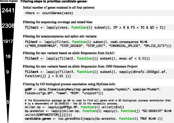 实验目的是验证MyGene.info与MyVariant.info在实际基因组数据分析流程中的实用性、高效性与准确性。方法细节:选取Ng等人2010年发表的Miller综合征外显子测序研究数据,该研究对4名Miller综合征患者的外周血基因组DNA进行外显子测序,通过基因组分析工具包(GATK)最佳实践流程处理得到原始变异数据集;使用R语言的mygene与myvariant Bioconductor包,调用Web服务实现变异过滤与候选基因优先级排序,具体步骤包括:筛选非同义突变、剪接位点突变与编码区插入缺失变异,排除1000基因组计划与Exome Aggregation Consortium(ExAC)数据库中次要等位基因频率>0.05的变异,筛选参与代谢过程的候选基因,基于Combined Annotation Dependent Depletion(CADD)致病性评分对候选基因排序。结果解读:经过多步过滤后,仅保留5个候选基因,其中包含已知的Miller综合征致病基因DHODH,证明该服务可高效缩小候选基因范围,且整个分析流程仅需约50行代码即可完成,无需本地部署任何注释数据库或大型分析工具,大幅降低了分析门槛与时间成本。