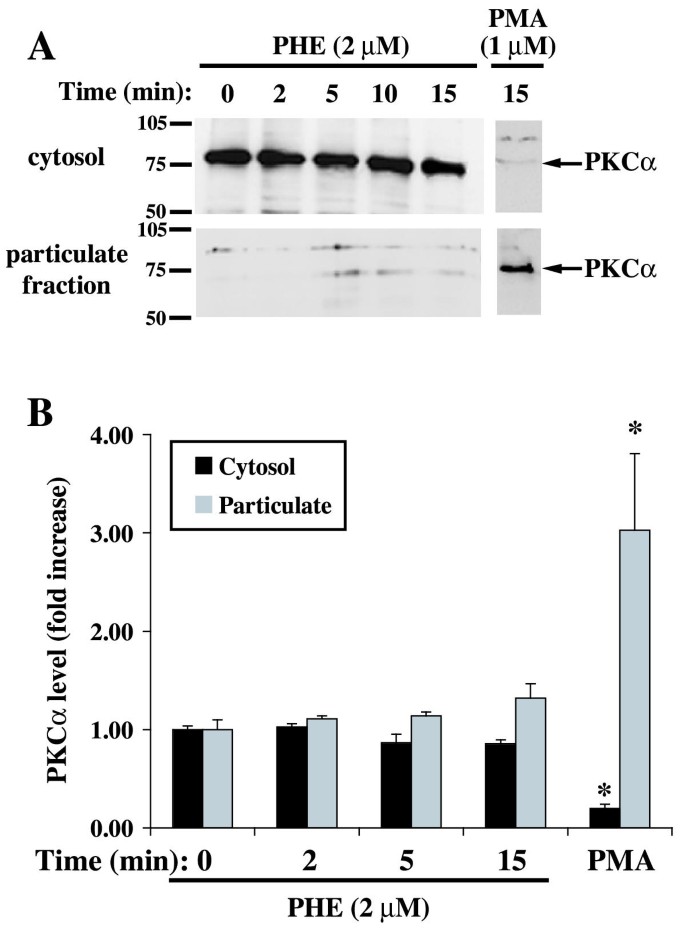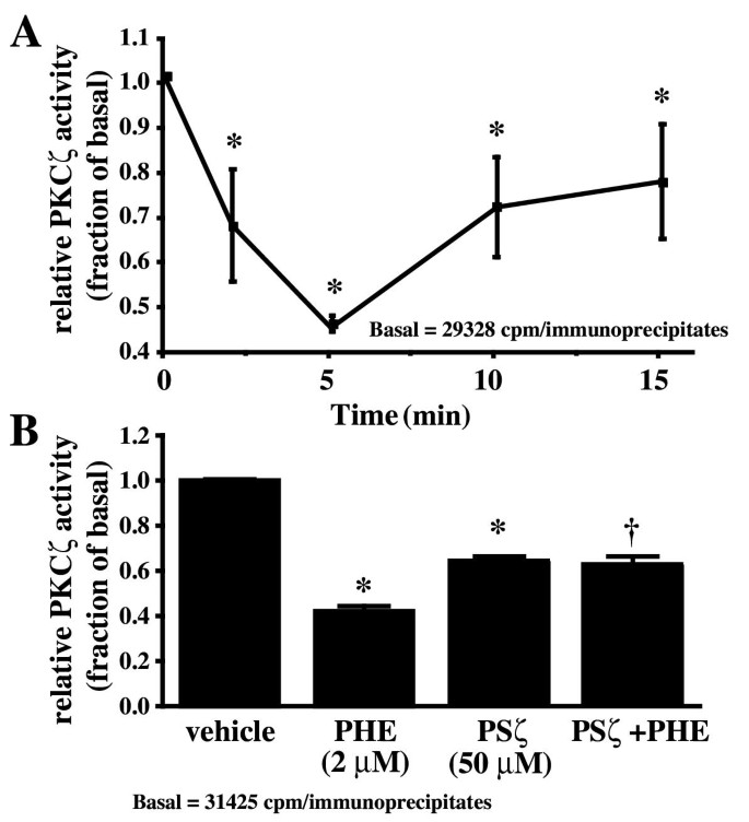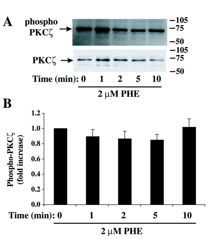 实验目的为明确PHE处理对PKCζ亚细胞定位、磷酸化水平及激酶活性的影响,初步探索二者的调控关系。实验方法为用PHE处理细胞不同时间后,通过细胞组分分离结合免疫印迹检测PKCα和PKCζ在胞质与颗粒组分中的分布;用磷酸化特异性抗体检测PKCζ的Thr410磷酸化水平(该位点磷酸化是PKCζ激活的标志);通过免疫沉淀法富集PKCζ,检测其激酶活性。实验结果显示,PHE处理后PKCα的亚细胞定位无显著变化,而PKCζ在15分钟时向颗粒组分轻微转位(n=5,P<0.05);PKCζ的Thr410磷酸化水平在PHE处理前后无显著差异;PKCζ的激酶活性在PHE处理2、5分钟时显著降低,10-15分钟回到亚基础水平(n=4,P<0.05);PKCζ特异性抑制剂(PSζ)可降低基础PKCζ活性,并阻断PHE诱导的PKCζ活性降低(n=4,P<0.01)。