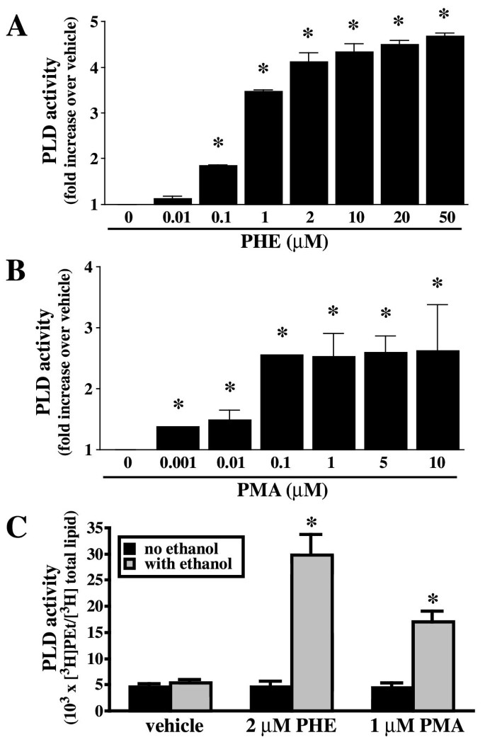 实验目的为确定PHE和佛波酯(PMA)对rat-1成纤维细胞PLD活性的激活效果,筛选后续实验的最优刺激浓度。实验方法为将稳定转染α₁A受体的rat-1成纤维细胞用[³H]油酸标记过夜,预处理乙醇后,加入不同浓度的PHE或PMA处理15分钟,通过薄层层析法检测磷脂酰乙醇(PEt)的生成量,以[³H]PEt与[³H]总脂质的比值反映PLD活性。实验结果显示,2μM PHE可使PLD活性升高至基础水平的4-5倍(n=3,P<0.05),1μM PMA可使PLD活性升高至基础水平的2.5倍;无乙醇条件下检测到的非PLD产物需进行校正,校正后PHE对PLD的激活倍数提升至30倍。
