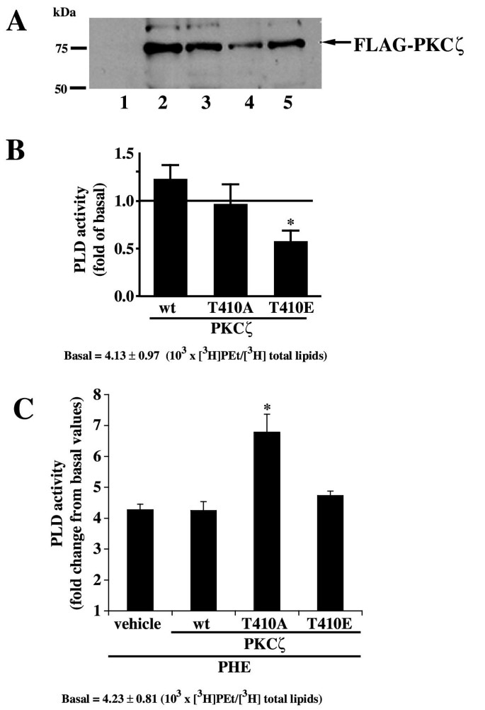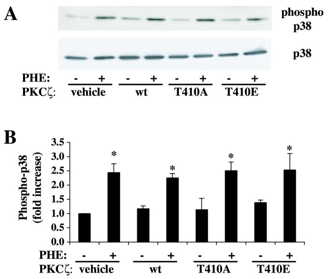 实验目的为验证PKCζ的催化活性是否参与PLD的激活调控。实验方法为瞬时转染野生型、激酶失活型(T410A,无法磷酸化激活)、组成型激活型(T410E,模拟持续激活)PKCζ至rat-1成纤维细胞,转染48小时后检测PLD活性;同时检测p38 MAPK的磷酸化水平,验证转染对α₁A受体信号通路的影响。实验结果显示,组成型激活型PKCζ对PHE诱导的PLD活性无显著影响,而激酶失活型PKCζ可显著增强PHE诱导的PLD活性(n=3,P<0.01);不同PKCζ突变体转染后,p38 MAPK的磷酸化水平无显著变化,说明转染未影响α₁A受体的信号通路功能。