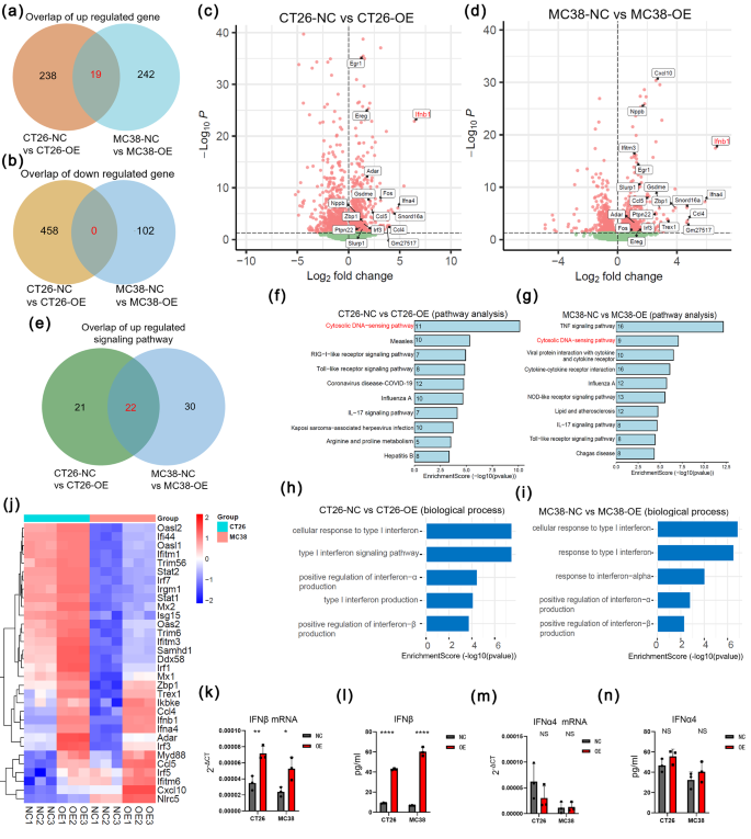 实验目的:通过转录组测序解析GSDME调控的分子通路,验证其对cGAS-STING-IFNβ通路的激活作用。方法细节:对GSDME过表达及对照组CT26、MC38细胞进行转录组测序,采用KEGG和GO富集分析差异表达基因;通过qRT-PCR、ELISA、蛋白免疫印迹检测IFNβ的表达及cGAS-STING通路关键分子的磷酸化水平;采用DNA提取与qPCR检测细胞质中双链DNA(dsDNA)和线粒体DNA(mtDNA)的含量。结果解读:转录组测序显示,GSDME过表达后I型干扰素应答相关基因显著富集,IFNβ的mRNA和蛋白水平在两种细胞系中均显著上调(P<0.01);细胞质中dsDNA和mtDNA含量显著升高(P<0.001),蛋白免疫印迹显示cGAS、STING、TANK结合激酶1(TBK1)、干扰素调节因子3(IRF3)的磷酸化水平显著上调;使用溴化乙锭(EtBr)去除mtDNA后,IFNβ的表达被显著抑制,证明mtDNA是激活cGAS-STING通路的关键分子。实验所用关键产品:Invitrogen的Trizol试剂(货号#15,596,018)、Takara的qPCR试剂盒、Thermo的蛋白免疫印迹检测系统等。
