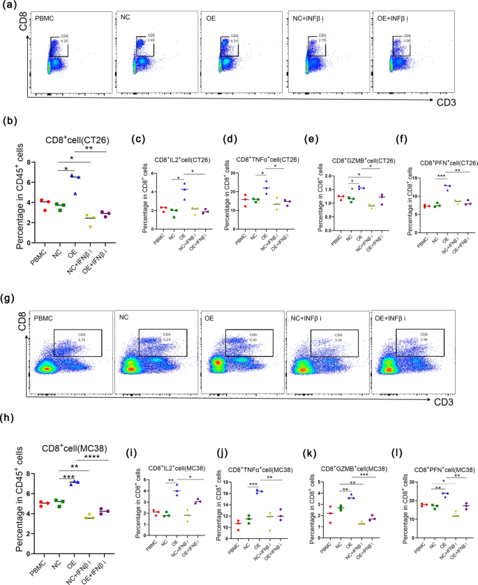 实验目的:验证GSDME在体内对结直肠癌生长的影响,以及对肿瘤微环境中CD8+T细胞浸润与功能的调控作用。方法细节:构建CT26(MSS亚型)和MC38(MSI亚型)荷瘤小鼠模型,分为对照组、GSDME过表达组、αPD1治疗组、GSDME过表达联合αPD1治疗组,每3天监测肿瘤体积,第16天处死小鼠并称重肿瘤组织;采用免疫组化(IHC)染色和流式细胞术分析肿瘤组织中CD8+T细胞的浸润比例及功能分子分泌情况。结果解读:CT26荷瘤模型中,单独GSDME过表达或αPD1治疗均未显著抑制肿瘤生长,但联合治疗组肿瘤体积和重量显著降低(P<0.05);MC38荷瘤模型中,GSDME过表达或αPD1单独治疗均能显著抑制肿瘤生长,联合治疗组的抗肿瘤效果最显著(P<0.0001);两种模型中GSDME过表达均能显著增加CD8+T细胞的浸润比例(P<0.05),联合治疗组CD8+T细胞分泌TNFα、PFN等功能分子的能力最强(P<0.05)。文献未提及具体实验产品,领域常规使用小鼠荷瘤模型构建试剂、免疫组化抗体、流式细胞术抗体类试剂。