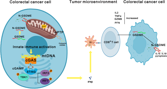 现有研究的关键结论包括:GSDME可通过caspase-3或颗粒酶B(GZMB)切割产生N端片段(N-GSDME),诱导肿瘤细胞焦亡;ICIs对微卫星不稳定(MSI)/错配修复缺陷(dMMR)结直肠癌患者疗效显著,但MSS/pMMR患者响应率极低;cGAS-STING通路可通过识别细胞质DNA激活I型干扰素应答,调控CD8+T细胞浸润。技术方法优势方面,现有研究多采用细胞系和动物模型验证GSDME的直接焦亡诱导作用,部分研究结合临床样本分析GSDME与预后的关联;但局限性也较为明显,多数研究聚焦于GSDME对肿瘤细胞的直接杀伤,缺乏对其调控肿瘤微环境免疫细胞浸润的机制研究,尤其是线粒体损伤作为上游事件激活cGAS-STING通路的机制尚未被揭示,同时也未明确GSDME与ICIs的协同作用在不同MSI亚型结直肠癌中的差异。本研究的创新价值在于,首次将GSDME的线粒体损伤效应与cGAS-STING-IFNβ通路关联,阐明了其招募CD8+T细胞的具体机制,并在MSS和MSI两种结直肠癌模型中验证了GSDME与ICIs的协同疗效,填补了领域内对GSDME调控肿瘤免疫微环境机制的研究空白,为MSS结直肠癌患者的ICIs联合治疗提供了新的靶点和生物标志物。