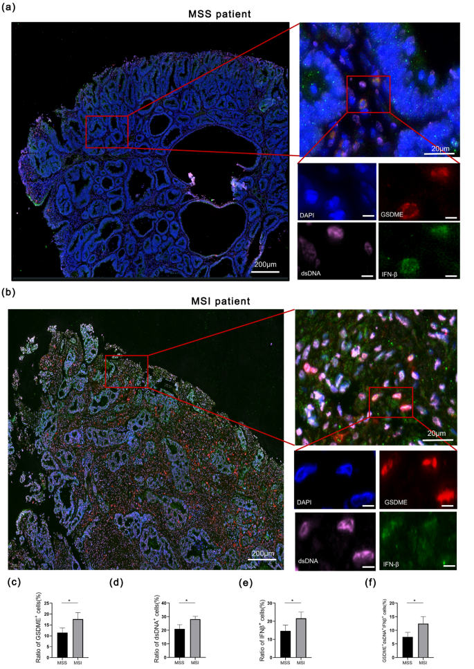 实验目的:明确GSDME表达与结直肠癌患者MSI亚型的关联,为其作为ICIs疗效预测标志物提供依据。方法细节:收集MSS和MSI结直肠癌患者的肿瘤组织样本,采用多重免疫组化染色检测GSDME、dsDNA、IFNβ的表达水平,统计阳性细胞比例。结果解读:MSI患者肿瘤组织中GSDME+细胞的比例显著高于MSS患者(n=3/4,P<0.05),同时dsDNA+、IFNβ+及三者共阳性细胞的比例也显著升高,提示GSDME表达与MSI亚型呈正相关,可作为MSI亚型的潜在标志物。文献未提及具体实验产品,领域常规使用多重免疫组化检测试剂盒。