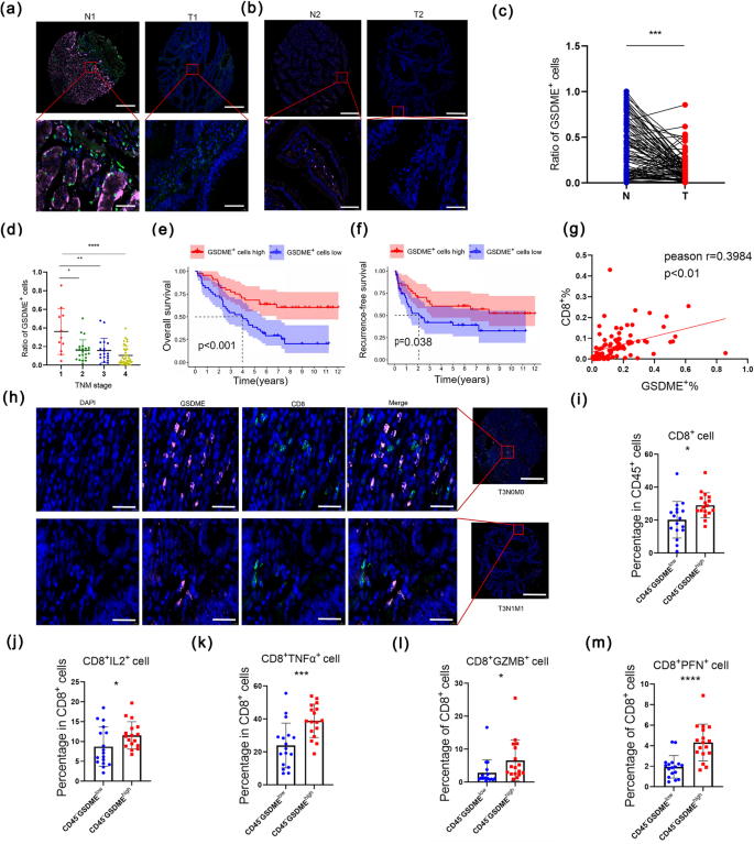 实验目的:明确GSDME在结直肠癌患者中的表达特征、与预后及CD8+T细胞浸润的关联,构建稳定过表达GSDME的结直肠癌细胞系。方法细节:收集90例结直肠癌组织芯片和34例配对肿瘤及癌旁正常组织,采用免疫荧光染色、实时荧光定量PCR(qRT-PCR)、流式细胞术分析GSDME表达与临床病理特征、CD8+T细胞浸润的关联;通过慢病毒转染构建CT26、MC38细胞系的GSDME稳定过表达株,采用qRT-PCR和蛋白免疫印迹(WB)验证mRNA和蛋白表达水平,重点检测N-GSDME的表达。结果解读:免疫荧光染色显示GSDME在结直肠癌组织中的表达显著低于癌旁正常组织(n=88,P<0.001),且表达水平随肿瘤分期升高而降低;高GSDME表达患者的总生存期(OS)和无复发生存期(RFS)显著长于低表达患者(n=44/组);GSDME表达与CD8+T细胞浸润呈正相关,高GSDME组患者肿瘤组织中CD8+T细胞比例更高(n=17/组,P<0.05),且CD8+T细胞分泌白细胞介素2(IL2)、肿瘤坏死因子α(TNFα)、GZMB、穿孔素(PFN)等功能分子的能力显著增强(P<0.05至P<0.0001);成功构建GSDME稳定过表达的CT26、MC38细胞系,N-GSDME蛋白水平显著上调。实验所用关键产品:Gibco的胎牛血清(货号#10,100,147)、Sigma-Aldrich的相关试剂、Invitrogen的qRT-PCR试剂等。