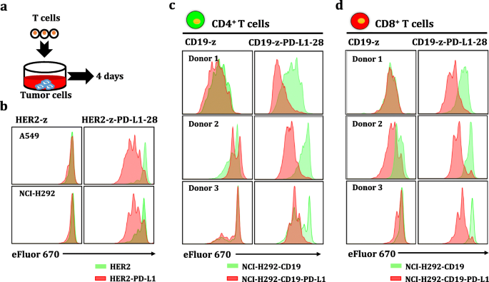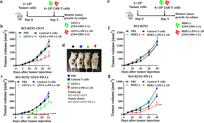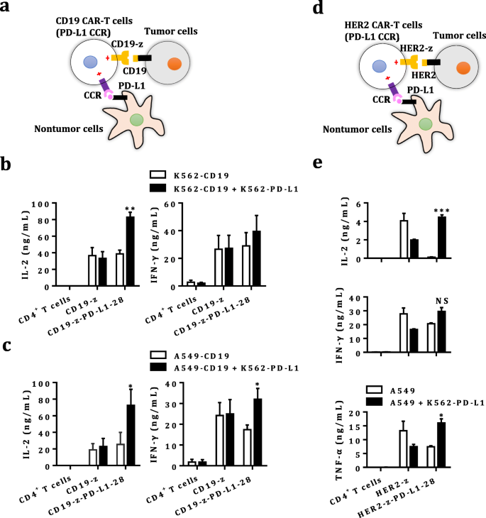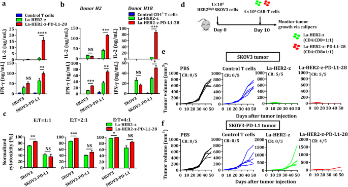 实验目的是构建表达CD19/HER2 CAR与PD-L1 CCR的慢病毒载体,以及对应表达靶抗原和PD-L1的肿瘤细胞模型,为后续功能验证奠定基础。方法细节:设计第一代CD19/HER2 CAR,包含CD19/HER2单链可变区(scFv)、CD8铰链跨膜区、CD3ζ信号域;同时设计PD-L1 CCR,包含PD-L1 scFv、CD28铰链跨膜区与共刺激域;通过自切割T2A肽将CAR与CCR连接,克隆至慢病毒载体;采用慢病毒转导人外周血T细胞,以及K562、A549、NCI-H292、SKOV3等肿瘤细胞,构建表达CD19/HER2、PD-L1的肿瘤细胞系,以及荧光素酶标记的细胞系用于体内成像。结果解读:通过流式细胞术验证,T细胞成功稳定表达CAR与CCR(阳性率>70%);肿瘤细胞系成功表达靶抗原与PD-L1(PD-L1表达率>90%),为后续实验提供了可靠的细胞模型。
