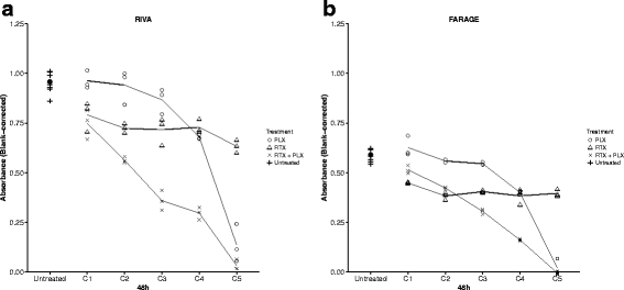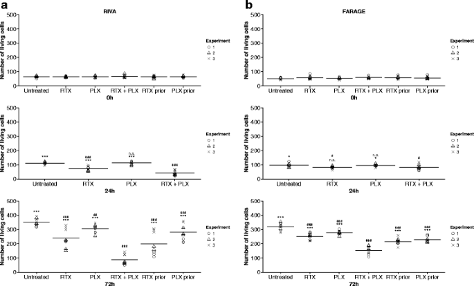 结果解读:台盼蓝排斥法结果显示,同时给予普乐沙福和利妥昔单抗可显著降低DLBCL细胞的活细胞数,与单药治疗相比差异具有统计学意义(RIVA细胞24-72h,P<0.001;FARAGE细胞72h,P<0.01),且协同作用呈剂量依赖性。序贯给药的效应显著弱于同时给药,RIVA细胞同时给药后活细胞数较对照组降低4倍,而序贯给药仅降低1.8倍。MTS实验进一步证实,在多数测试浓度下,联合治疗的增殖抑制效应均优于单药治疗。
