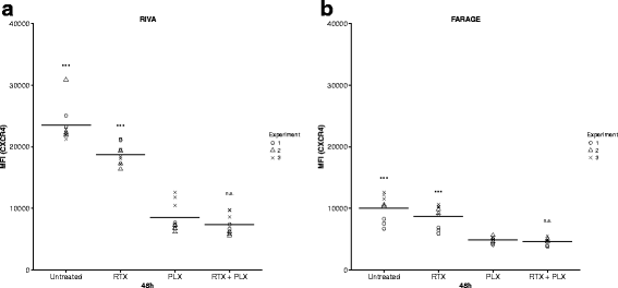 Biomarker来源为DLBCL细胞系表面的CXCR4蛋白,验证方法为流式细胞术定量检测细胞表面CXCR4的中位荧光强度。实验结果显示,普乐沙福处理后,RIVA细胞的CXCR4中位荧光强度显著降低(n=3,P<0.001),FARAGE细胞的CXCR4表达也呈显著下降趋势(n=3,P<0.001)。未检测该Biomarker的特异性与敏感性数据(文献未明确提供该数据,基于图表趋势推测)。