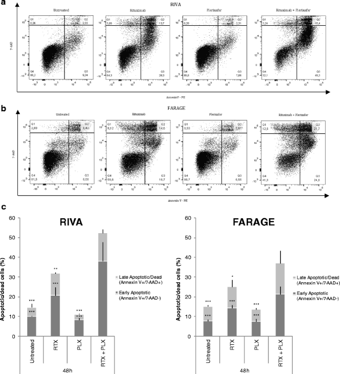 结果解读:联合治疗组的早期凋亡细胞比例及晚期凋亡/死亡细胞比例均显著高于单药组,RIVA细胞早期凋亡比例升高尤为明显(P<0.001),证实普乐沙福可通过增强利妥昔单抗的促凋亡作用发挥协同效应,且该效应在利妥昔单抗敏感的细胞系中更为显著。