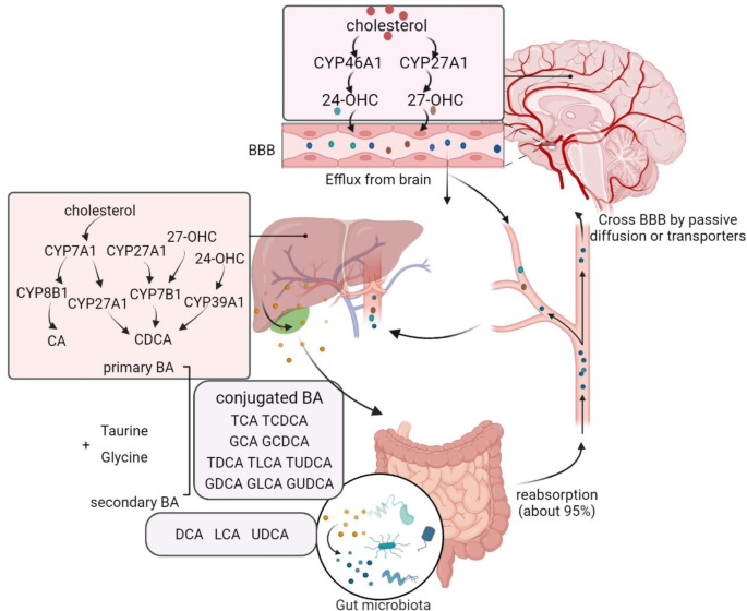 方法细节:整合已有的分子生物学研究(如酶基因敲除/过表达动物模型)、代谢组学分析(如胆汁酸亚型定量),梳理肝脏经典/替代合成通路、肠道微生物介导的次级胆汁酸转化、脑内CYP46A1与CYP27A1介导的胆固醇代谢通路,以及胆汁酸跨BBB的转运方式。