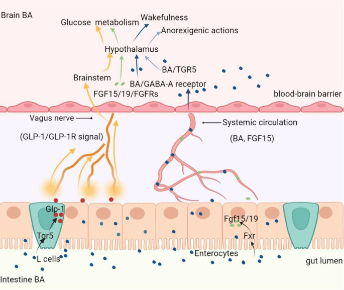 结果解读:直接通路中,胆汁酸可激活脑内FXR、TGR5受体,调节神经递质释放与神经元兴奋性;还可作为NMDA、GABAA受体的拮抗剂,影响神经元活动(如UDCA通过阻断GABAA受体促进觉醒)。间接通路中,外周胆汁酸激活肠道FXR诱导FGF15/19分泌,FGF15/19跨BBB进入脑内激活成纤维细胞生长因子受体4(FGFR4),参与糖代谢与能量稳态调控;激活肠道L细胞TGR5诱导GLP-1分泌,GLP-1通过迷走神经-脑干-下丘脑通路传递信号,抑制摄食。
