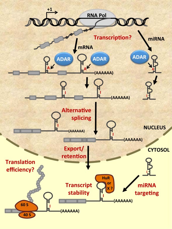 该图系统展示了ADAR与RNA编辑对细胞RNA种类的调控模式,涵盖可变剪接、转录本稳定性、miRNA生物发生与功能等多个环节,直观呈现了RNA编辑与多种转录后调控机制的交互网络,为理解基因表达调控的复杂性提供了可视化框架。