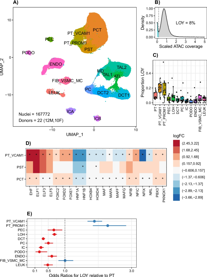 方法细节:整合22个供体的167772个细胞核的snATAC-seq数据,包括健康对照和CKD患者,通过聚类识别PT_VCAM1和PT_PROM1两种损伤近端小管亚群,用GLMM分析不同细胞类型的LOY odds比。