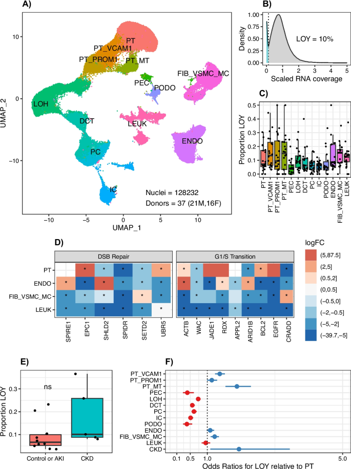 结果解读:UMAP聚类清晰区分多种肾细胞类型(图2A),男性细胞中LOY比例为8%,PT_VCAM1和PT_PROM1损伤细胞的LOY比例最高,PT_VCAM1的LOY odds比正常近端小管高1.88倍(95% CI 1.67–2.11,p=6.5e-27),PT_PROM1的LOY odds比正常近端小管高2.28倍(95% CI 1.83–2.83,p=8.9e-14),进一步验证了LOY在损伤近端小管细胞中的富集。