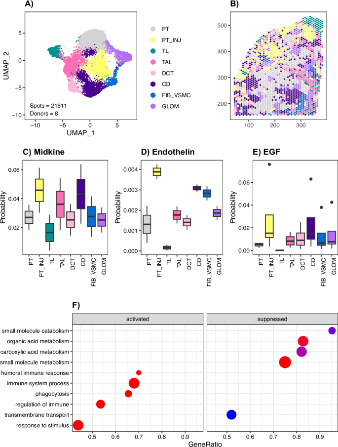 结果解读:空间转录组显示PT_INJ细胞位于促纤维化微环境(图5B),分泌Midkine、Endothelin、EGF等信号分子,与浸润的免疫细胞存在交互(图5C-E),通路富集显示PT_INJ细胞激活免疫相关信号通路,提示LOY细胞可能通过分泌信号调控肾纤维化微环境。