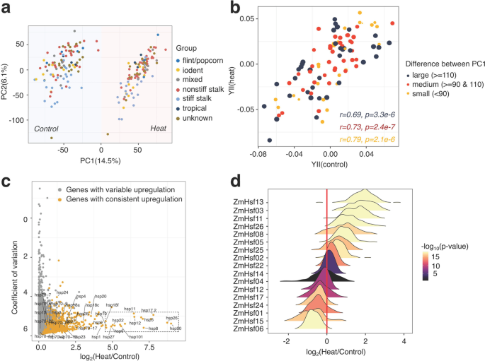 结果解读:PCA第一主成分可完全区分对照与热胁迫样品,表明热胁迫对转录组的影响远大于基因型差异;第二主成分可部分区分基因型,但未呈现明显亚群分离;转录组可塑性(对照与热胁迫PCA第一主成分差值)与光合表型响应正相关,说明转录组变异是表型变异的重要分子基础;鉴定到2628个群体水平一致上调的基因,其中包含25个HSP基因与8个HSF基因(如ZmHsf02、ZmHsf25),而ZmHsf06在所有基因型中均表现为下调;GO富集分析显示,热上调基因显著富集于“热响应”“热驯化”“热激蛋白结合”等功能条目,验证了转录组数据的可靠性。