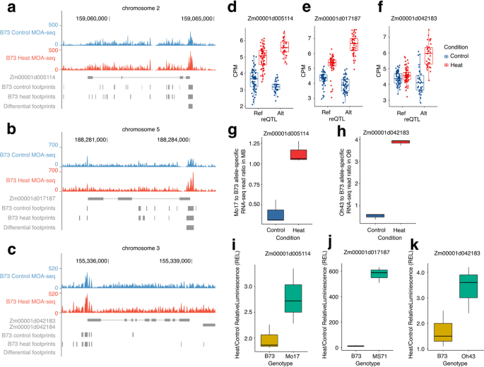 Biomarker来源涵盖玉米全基因组范围的SNP/InDel变异、基因表达特征与染色质可及性区域。验证方法包括:全基因组关联分析(GWAS)关联基因型与光合表型,eQTL定位关联基因型与基因表达,MOA-seq解析染色质可及性变化,瞬时表达实验直接验证调控元件功能。特异性方面,reGenes在不同基因型中呈现显著差异的热响应模式,例如部分基因的参考等位基因在热胁迫下上调幅度是替代等位基因的1.5-2.0倍,而部分基因则相反;热富集染色质足迹仅与热上调基因显著关联,与非差异表达基因无显著关联。敏感性方面,热富集足迹与热上调基因的关联显著性达p<2.2e-16,表明其可有效标记热响应的功能调控区域。