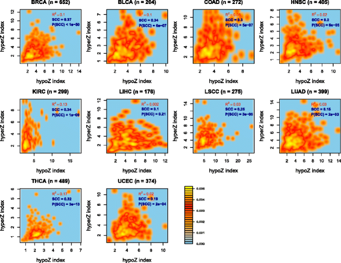 结果解读:二维密度图显示,在所有10种癌种中,HyperZ与HypoZ的相关性极弱(R²值约0.1或更低),仅因样本量较大具有统计学显著性,表明全基因组DNA高甲基化和低甲基化是两个独立的调控过程;乳腺癌亚型分析显示,luminal B亚型的HyperZ和HypoZ指数均最高,HER2+亚型的HyperZ指数与luminal B相当,但HypoZ指数显著更低,进一步验证了二者调控机制的独立性。