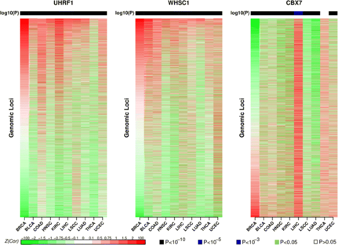 结果解读:热图显示,与UHRF1、WHSC1、CBX7表达相关性最高的基因组区域,在10种癌种中的排序高度一致,Spearman秩相关的P值均小于0.001,表明这些核心调控因子的作用位点具有泛癌普遍性;进一步分析显示,这些高关联位点在肿瘤与正常组织中的甲基化水平差异显著,具有明确的生物学意义。