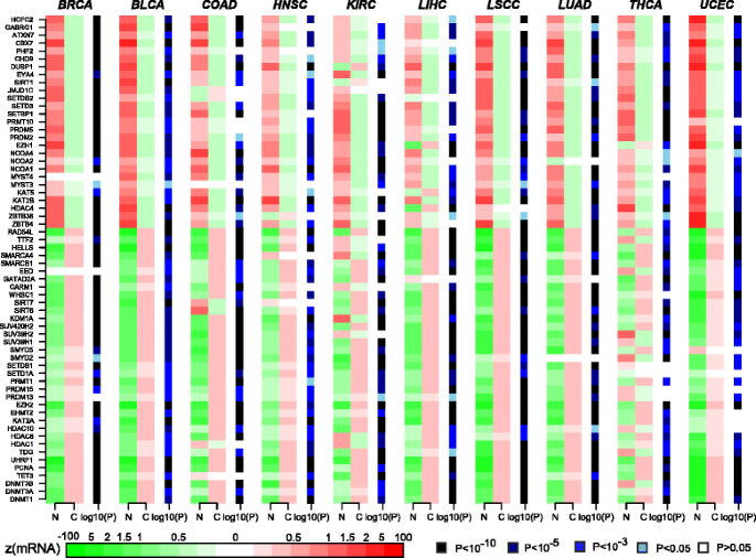 方法细节:从近期权威综述和文献检索中收集212个表观遗传酶基因,涵盖DNA甲基转移酶、组蛋白修饰酶、染色质重塑酶等所有核心表观调控功能类别;下载TCGA数据库中10种癌种(乳腺癌、膀胱癌等)的RNA-seq V2水平3数据,经过零值替换、对数转换、批次效应校正等质量控制步骤后,采用校正t检验分析正常与癌组织的基因表达差异;筛选在至少8种癌种中呈现一致上调或下调的基因,并通过二项式模型分析结果的统计学显著性。