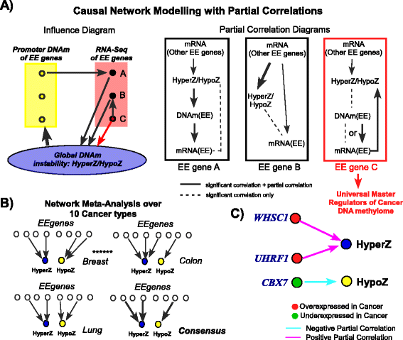 方法细节:筛选同时满足“跨癌种一致失调”和“与DNA甲基化指数一致关联”的18个表观遗传酶,采用偏相关分析构建因果调控网络,控制其他17个表观遗传酶的表达水平及所有18个基因的启动子DNA甲基化水平,评估每个表观遗传酶与HyperZ、HypoZ指数的直接关联;构建10种癌种的共识调控网络,筛选在至少6种癌种中存在直接关联的核心调控因子。