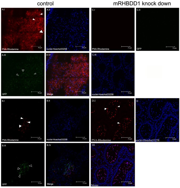实验目的是明确mRHBDD1在体内精原细胞存活与分化中的功能。方法为用白消安(40mg/kg)处理6-7周龄雄性BALB/c小鼠,4-5周后清除内源性生精细胞,将敲低细胞和阴性对照细胞分别注射到小鼠双侧睾丸的生精小管中,8周后取睾丸组织做冰冻切片,采用TRITC/Rhodamine标记的花生凝集素(PNA)染色顶体,Hoechst 33258染色细胞核,通过共聚焦激光显微镜观察细胞的存活与分化情况。结果显示,阴性对照细胞可在生精小管中存活并分化为带有GFP标记的精子细胞,顶体被PNA特异性染色;而敲低细胞在生精小管和附睾中均未被检测到,仅残留的内源性生精细胞可分化为精子,提示mRHBDD1敲低导致精原细胞丧失体内存活与分化的能力。实验所用关键产品:白消安(Sigma)、TRITC/Rhodamine标记的花生凝集素(PNA,Sigma)、Hoechst 33258(Sigma)、Leica共聚焦激光显微镜。