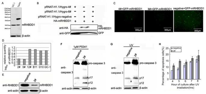 实验目的是明确mRHBDD1对精原细胞凋亡的调控作用。方法为用凋亡刺激剂PS341(1μM处理12h)和UV照射(65mJ)处理敲低细胞和阴性对照细胞,通过蛋白质免疫印迹检测caspase 3的切割水平,采用流式细胞术检测UV处理后的细胞凋亡率。结果显示,敲低细胞中caspase 3的切割产物p17/p12水平显著高于对照组,流式细胞术结果显示UV处理后敲低细胞的凋亡率显著升高(n=3,P<0.05),提示mRHBDD1具有抑制精原细胞凋亡的功能,其缺失会导致细胞对凋亡刺激的敏感性增强。实验所用关键产品:PS341(Sigma)、抗caspase 3抗体(Santa Cruz)、COULTER流式细胞仪(EPICS-XL)。