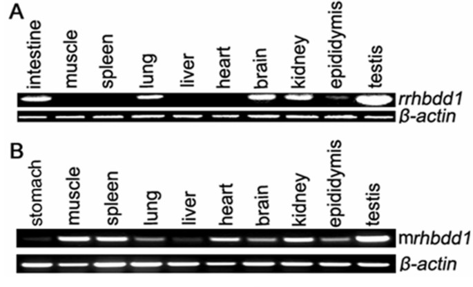 实验目的是明确mRHBDD1在小鼠和大鼠不同组织中的表达分布,筛选其功能相关的靶组织。方法为采集小鼠和大鼠的肠、肌肉、脾、肺、肝、心、脑、肾、附睾、胃和睾丸组织样本,采用Trizol试剂提取总RNA,通过反转录聚合酶链反应(RT-PCR)检测mrhbdd1和rrhbdd1的表达水平,以β-actin作为内参进行标准化。结果显示,mrhbdd1和rrhbdd1在多组织中均有基础表达,但在睾丸组织中的表达水平显著高于其他组织(n=3,文献未明确具体P值,基于图表趋势推测差异显著),提示其可能在睾丸的生理功能调控中发挥关键作用。实验所用关键产品:Trizol试剂(Invitrogen)、SuperScript™ First-Strand Synthesis System(Invitrogen)。