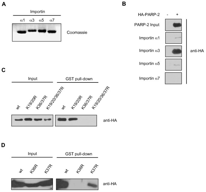 实验目的是明确K36是否介导PARP-2与importinα的结合,从分子层面解释核定位障碍的机制。方法细节:采用GST pull-down实验,将人源importinα1、α3、α5、α7构建为GST融合蛋白并纯化;将纯化的GST-importinα与表达野生型或突变体PARP-2的HEK293T细胞裂解液孵育,通过谷胱甘肽琼脂糖珠捕获复合物,免疫印迹检测结合的PARP-2。结果解读:GST pull-down结果(图5B-D)显示,野生型PARP-2主要与importinα3结合,与importinα1、α5的结合极弱,不与importinα7结合;K36/37R、K36R突变体无法与importinα3结合,而K37R突变体与importinα3的结合能力与野生型相当,说明K36是PARP-2与importinα3结合的关键残基,这一结合缺失是K36R突变体无法入核的分子机制。产品关联:文献未提及具体实验产品,领域常规使用GST融合蛋白表达系统、谷胱甘肽琼脂糖珠、免疫印迹检测试剂等。