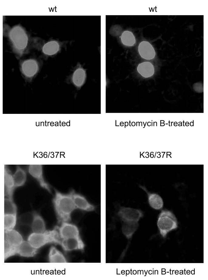 实验目的是明确哪些赖氨酸残基参与PARP-2的核定位,并区分核导入障碍与核出口增强导致的定位异常。方法细节:将野生型及突变体PARP-2转染至HEK293T细胞,甲醇固定后通过免疫荧光染色检测HA标签蛋白的亚细胞定位;同时对转染K36/37R突变体的细胞使用Leptomycin B(LMB)处理,LMB是CRM-1介导的核出口抑制剂,处理后观察定位变化以排除核出口影响。结果解读:免疫荧光结果(图2A、图4B)显示,野生型PARP-2与K19/20R突变体均定位于细胞核,而K36/37R、K19/20/36/37R突变体仅定位于细胞质;将K36/37突变为E或M时,同样导致PARP-2定位于细胞质,说明K36/37的功能并非依赖正电荷,而是氨基酸结构;LMB处理后K36/37R突变体仍定位于细胞质(图3),说明其定位异常是核导入障碍而非核出口增强;单突变体实验显示,K36R突变体定位于细胞质,K37R突变体定位于细胞核,明确K36是PARP-2核定位的关键残基。产品关联:实验所用关键产品:Leptomycin B(核出口抑制剂)、FITC标记的抗小鼠二抗、共聚焦显微镜;其余未提及产品为领域常规使用的免疫荧光染色试剂、细胞固定试剂等。