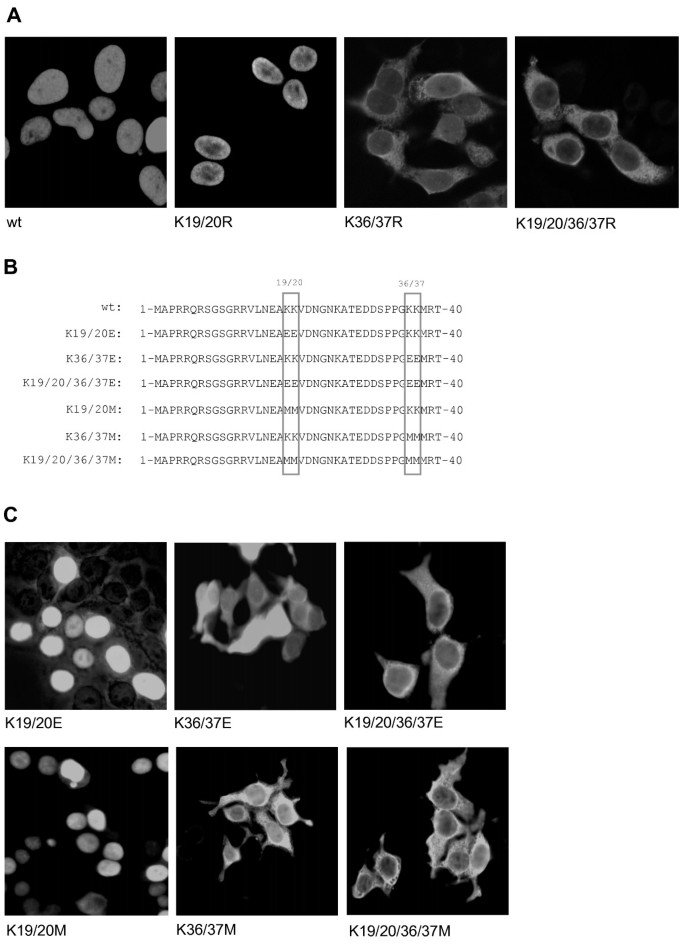 本研究的核心目标是明确PARP-2核定位的关键功能残基及依赖的核定位信号类型,核心科学问题是PARP-2的核定位是否依赖此前推测的双分型核定位信号,以及哪些残基介导其与核转运受体的结合;技术路线遵循“序列分析假设→定点突变构建突变体→亚细胞定位验证→相互作用实验验证→结论”的闭环逻辑,通过多层次实验明确了K36的关键作用。