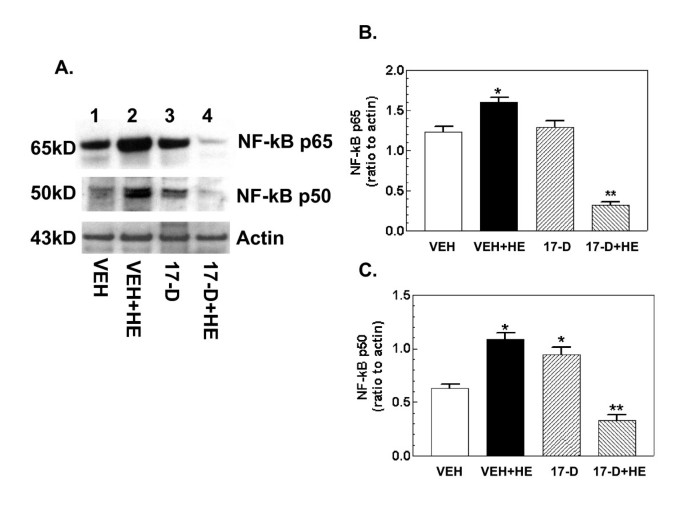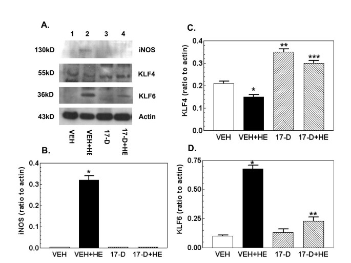 实验目的是验证17-DMAG对出血诱导的iNOS通路激活的抑制作用,明确其上游调控机制。方法细节为:小鼠口服给予10mg/kg 17-DMAG或溶媒,16小时后进行出血处理,6小时后取小肠组织,通过蛋白免疫印迹检测iNOS、Kruppel样因子4(KLF4)、Kruppel样因子6(KLF6)、核因子κB(NF-κB)p65及p50的蛋白表达水平。结果解读:出血处理显著上调iNOS、KLF6、NF-κB p65及p50的蛋白表达,同时下调KLF4表达(n=4-5,P<0.05);17-DMAG处理可完全逆转上述变化,使各分子表达恢复至假手术组水平,提示17-DMAG通过调控iNOS通路的转录因子(NF-κB、KLF4、KLF6)抑制iNOS的激活。实验所用关键产品:BD Signal Transduction的iNOS抗体、Santa Cruz Biotechnology的KLF4、KLF6、NF-κB抗体。