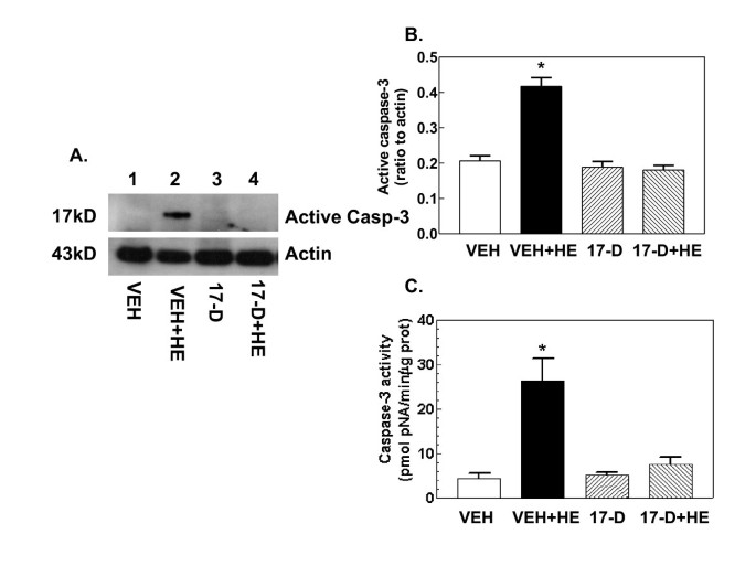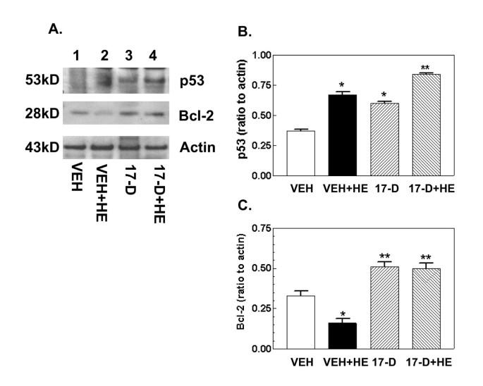 实验目的是验证17-DMAG对出血诱导的细胞凋亡及小肠黏膜损伤的保护作用,明确其最终效应。方法细节为:通过蛋白免疫印迹检测caspase-3、Bcl-2及p53的蛋白表达,采用酶活性检测试剂盒检测caspase-3的活性,同时对小肠组织进行苏木精-伊红(H&E)染色,分析绒毛高度、宽度及黏膜损伤评分。结果解读:出血处理显著激活caspase-3的活性及蛋白表达,下调Bcl-2的表达,上调p53的表达,同时导致小肠绒毛缩短增宽、黏膜损伤评分升高(n=4-5,P<0.05);17-DMAG处理可完全抑制caspase-3的激活,上调Bcl-2的表达,同时显著改善小肠绒毛形态,降低黏膜损伤评分,恢复至假手术组水平,但对p53的上调无显著影响,提示17-DMAG通过上调抗凋亡蛋白Bcl-2、抑制caspase-3激活减轻细胞凋亡,从而保护小肠黏膜结构。实验所用关键产品:Epitomics的caspase-3抗体、Santa Cruz Biotechnology的Bcl-2抗体、苏木精-伊红染色试剂。