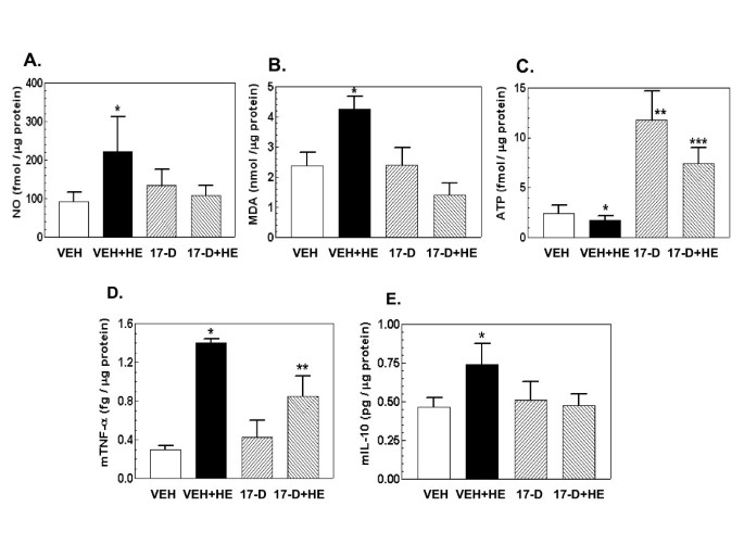 实验目的是检测17-DMAG对出血诱导的氧化应激、能量耗竭及炎症因子释放的调控作用,明确其功能效应。方法细节为:采用试剂盒检测小肠组织中的NO水平、丙二醛(MDA,脂质过氧化产物)水平及细胞ATP含量,通过酶联免疫吸附试验(ELISA)检测肿瘤坏死因子-α(TNF-α)、白细胞介素-10(IL-10)及白细胞介素-6(IL-6)的浓度。结果解读:出血处理显著升高NO、MDA水平,降低细胞ATP含量,同时上调TNF-α、IL-10及IL-6的浓度(n=4-5,P<0.05);17-DMAG处理可显著抑制NO、MDA的升高,恢复细胞ATP水平,降低TNF-α及IL-10的浓度,但对IL-6的浓度无显著影响,提示17-DMAG可减轻出血诱导的氧化应激及能量耗竭,同时调控炎症因子的释放。实验所用关键产品:NO检测试剂盒、CalBiochem的脂质过氧化检测试剂盒、Roche的ATP检测试剂盒、Biocompare的细胞因子ELISA试剂盒。