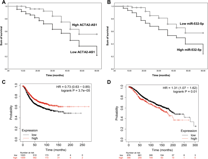 本环节核心目标是明确ACTA2-AS1和miR-532-5p的表达与三阴性乳腺癌患者恶性程度及预后的关联。研究团队以两种非编码RNA的表达均值为界,将患者分为高表达组与低表达组,分析其与患者临床病理特征的相关性,并通过Kaplan-Meier生存分析、Cox多因素回归模型评估两者的预后价值。结果显示,低ACTA2-AS1表达与高miR-532-5p表达均与患者淋巴结转移阳性、高组织学分级、晚期TNM分期显著相关(P<0.05);生存分析显示,低ACTA2-AS1组患者总生存率显著低于高表达组(log rank P=0.034),高miR-532-5p组患者总生存率显著低于低表达组(log rank P=0.018);Cox多因素回归分析证实,ACTA2-AS1(风险比HR=3.247)、miR-532-5p(HR=3.214)与TNM分期、组织学分级、淋巴结转移状态均为三阴性乳腺癌患者的独立预后因素(P<0.05)。