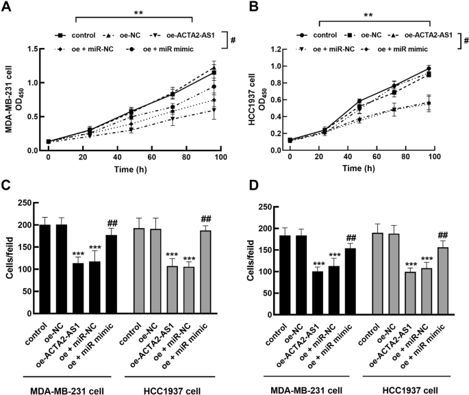 本环节核心目标是验证ACTA2-AS1通过靶向miR-532-5p调控三阴性乳腺癌细胞的恶性生物学行为。研究团队通过细胞转染技术在MDA-MB-231和HCC1937细胞中过表达ACTA2-AS1,或同时过表达miR-532-5p,采用CCK-8实验检测细胞增殖能力,Transwell实验检测细胞迁移及侵袭能力。结果显示,过表达ACTA2-AS1可显著抑制三阴性乳腺癌细胞的增殖、迁移及侵袭能力(P<0.01),而同时过表达miR-532-5p可逆转ACTA2-AS1的抑癌作用,恢复细胞的增殖、迁移及侵袭能力(P<0.05),证实ACTA2-AS1通过靶向调控miR-532-5p发挥抑癌作用。
