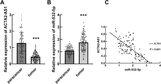 本环节核心目标是检测ACTA2-AS1和miR-532-5p在三阴性乳腺癌组织中的表达水平及相关性。研究团队收集了119例初治三阴性乳腺癌患者的肿瘤组织及配对癌旁正常组织,采用实时荧光定量PCR(qRT-PCR)技术检测两种非编码RNA的相对表达量。结果显示,与癌旁组织相比,三阴性乳腺癌组织中ACTA2-AS1的表达显著下调,miR-532-5p的表达显著上调(n=119,P<0.001),且两者的表达水平呈显著负相关(相关系数r=-0.701,P<0.001)。