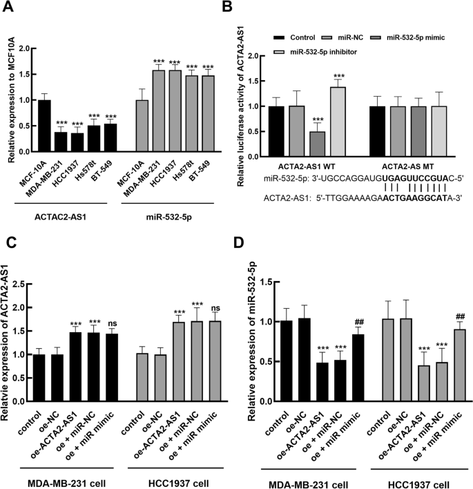 本环节核心目标是在细胞水平验证ACTA2-AS1与miR-532-5p的表达模式及靶向结合关系。研究团队培养了4种三阴性乳腺癌细胞系(MDA-MB-231、HCC1937、Hs578t、BT-549)及正常乳腺上皮细胞系MCF-10A,采用实时荧光定量PCR检测两种非编码RNA的表达;同时构建ACTA2-AS1的野生型及突变型荧光素酶报告载体,通过双荧光素酶报告实验验证miR-532-5p与ACTA2-AS1的靶向结合。结果显示,与正常乳腺细胞相比,三阴性乳腺癌细胞中ACTA2-AS1表达显著下调,miR-532-5p表达显著上调(P<0.001);过表达miR-532-5p可显著抑制野生型ACTA2-AS1报告载体的荧光素酶活性,而对突变型载体无显著影响(P<0.001),证实两者存在靶向结合关系。