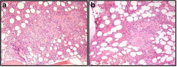 本环节的核心目标是评估糖皮质激素治疗对孤立性骨髓结节病伴高钙血症的疗效,观察患者的长期病情转归。研究团队首先予患者9天快速泼尼松递减治疗,患者血清钙水平暂时改善,但停药后高钙血症复发;随后调整为4个月缓慢泼尼松递减治疗,治疗期间定期复查血清钙、ACE及CBC指标,5个月后重复骨髓活检。结果显示,缓慢激素递减治疗后患者血清钙水平恢复正常,ACE水平也降至正常范围;5个月后的骨髓活检显示肉芽肿部分消退,无恶性病变迹象(