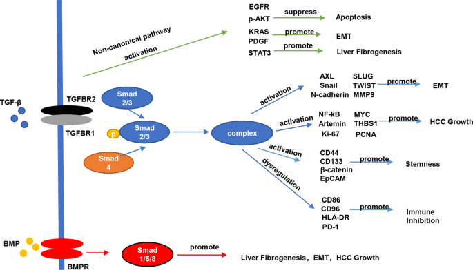 该图系统性展示了TGF-β通过经典SMAD通路与非经典通路(AKT、KRAS、EGFR等)调控HCC相关进程的分子网络,涵盖肝纤维化、肿瘤生长、干细胞特性维持、EMT、凋亡调控及免疫抑制等多个核心环节。产品关联:文献未提及具体实验产品,领域常规使用免疫组化试剂盒、Western blot抗体、qRT-PCR试剂等实验材料。