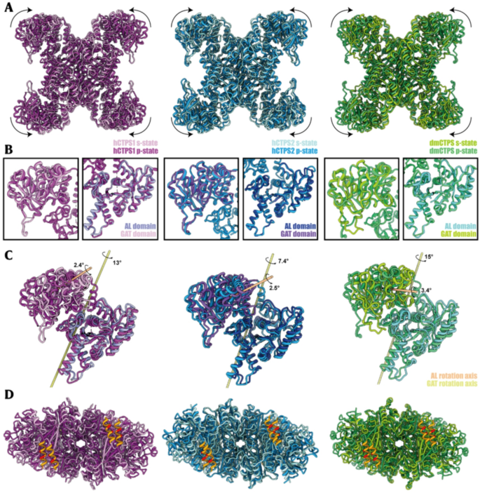 实验目的为分析hCTPS1丝聚化调控机制的进化保守性,明确真核CTPS丝聚化的共同模式。方法细节:将hCTPS1的结构与hCTPS2、果蝇DmCTPS的结构进行比对,同时对三个物种的CTPS序列进行同源性分析,重点比较CTP结合口袋和丝聚体组装界面的残基保守性。结果解读:结构比对显示,hCTPS1与hCTPS2、DmCTPS的CTP结合口袋残基高度保守,丝聚体组装界面的构象变化模式一致,均通过GAT结构域的旋转实现丝聚体组装,而与原核EcCTPS的组装模式不同,证明真核CTPS的丝聚化调控机制具有进化保守性。产品关联:文献未提及具体实验产品,领域常规使用序列比对软件(如ClustalW)、结构比对工具(如ChimeraX)。