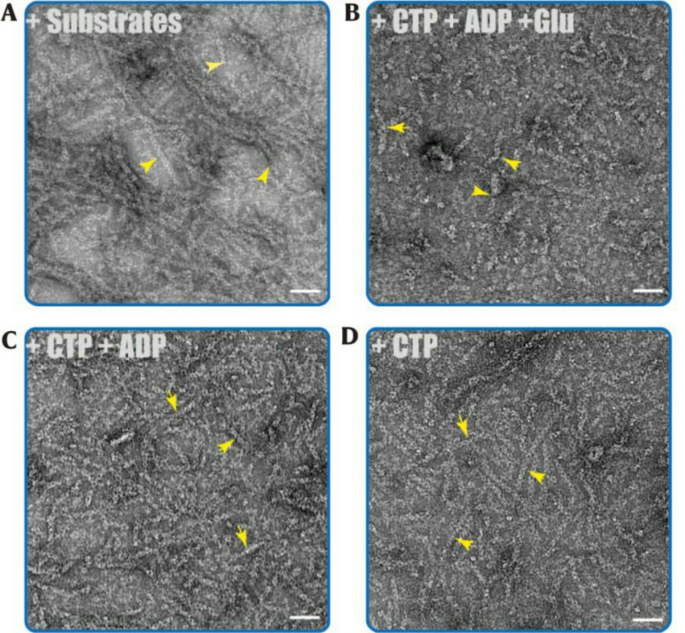 实验目的为验证不同配体(底物、产物)对hCTPS1丝聚化的调控作用,明确CTP在丝聚化中的功能。方法细节:将hCTPS1分别与底物组合(ATP、UTP、GTP、谷氨酰胺)、产物组合(CTP、ADP、谷氨酸)及单独CTP混合,在含镁离子的缓冲液中孵育,采用负染电镜技术观察丝聚体形成情况,电镜为120kV的Talos L120C,放大倍数为57000×。结果解读:负染电镜结果显示,hCTPS1在单独CTP存在下可形成清晰的丝聚体结构,且加入CTP后数秒内即可观察到丝聚体,挑战了此前认为CTP触发丝聚体解聚的结论;同时在产物组合及底物组合中均能观察到丝聚体,证明hCTPS1的丝聚化可在底物和产物结合状态下发生。产品关联:实验所用关键产品:ThermoFisher的Talos L120C透射电镜、Ceta CMOS相机、Zhongjingkeyi Technology的亲水碳膜铜网。