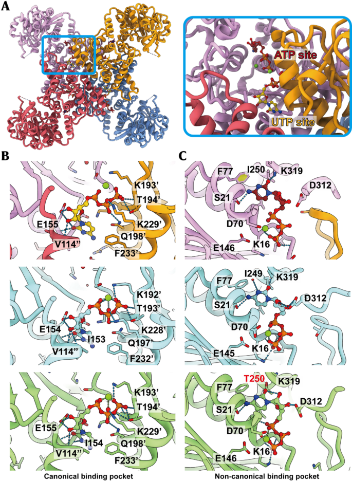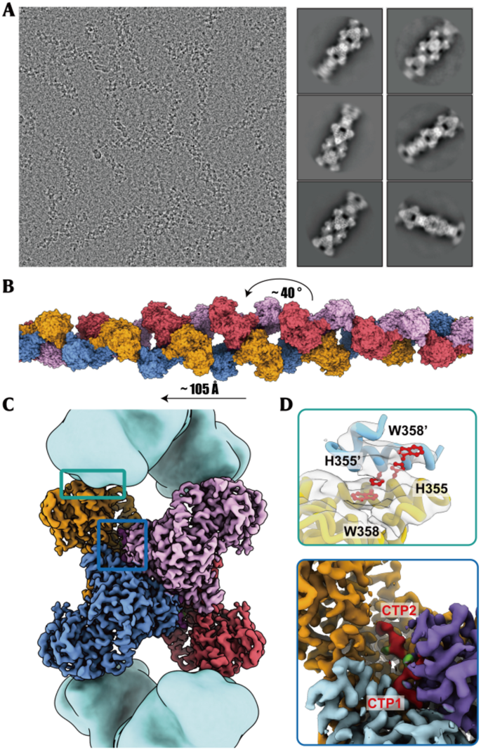 实验目的为解析CTP结合状态下hCTPS1丝聚体的高分辨率结构,揭示CTP调控丝聚化的分子细节。方法细节:采用谷氨酰胺类似物DON稳定hCTPS1的GAT结构域,制备CTP结合的hCTPS1丝聚体冷冻电镜样本,使用300kV的Titan Krios电镜收集数据,通过RELION软件进行数据处理和三维重构,最终获得分辨率为3.3Å的结构。结果解读:冷冻电镜结构显示,hCTPS1丝聚体由四聚体以螺旋方式排列组成,每个螺旋单元沿轴上升105Å、扭转约40°;每个hCTPS1单体存在两个CTP结合口袋,分别为经典口袋(与UTP结合位点重叠)和非经典口袋(与ATP结合位点重叠),关键残基H355和W358参与丝聚体的组装界面,为丝聚化提供结构基础。产品关联:实验所用关键产品:ThermoFisher的Titan Krios冷冻透射电镜、Gatan K3 summit相机、RELION数据处理软件、Chimera结构可视化工具。