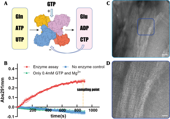 本研究的核心发现围绕hCTPS1丝聚化的调控机制展开,其丝聚化状态可作为细胞内CTP水平及增殖状态的潜在生物标志物,为代谢紊乱相关疾病的诊断和治疗提供新靶点。Biomarker定位:本研究中涉及的生物标志物为hCTPS1的丝聚化状态,属于代谢酶功能状态标志物,筛选与验证逻辑为“体外酶活验证丝聚化条件→电镜观察丝聚体形成→冷冻电镜解析结构基础→保守性分析确认进化意义”的完整链条。研究过程详述:该标志物的来源为体外纯化的hCTPS1蛋白及模拟细胞内代谢环境的反应体系,验证方法包括负染电镜观察、冷冻电镜结构解析及酶活实验,特异性表现为CTP可特异性诱导hCTPS1形成丝聚体,而谷氨酸单独存在时无法诱导丝聚化;敏感性方面,加入CTP后数秒内即可观察到丝聚体形成,反映了丝聚化调控的快速响应特性。核心成果提炼:首次证明CTP是hCTPS1丝聚化的促进因子而非解聚因子,揭示了hCTPS1通过两个保守CTP结合口袋实现丝聚化的分子机制,该调控模式在真核CTPS中高度保守;该发现不仅阐明了hCTPS1的新型活性调控机制,还为靶向hCTPS1的抗肿瘤、免疫疾病治疗药物研发提供了精准的结构基础,文献未提供相关统计学P值及样本量数据。