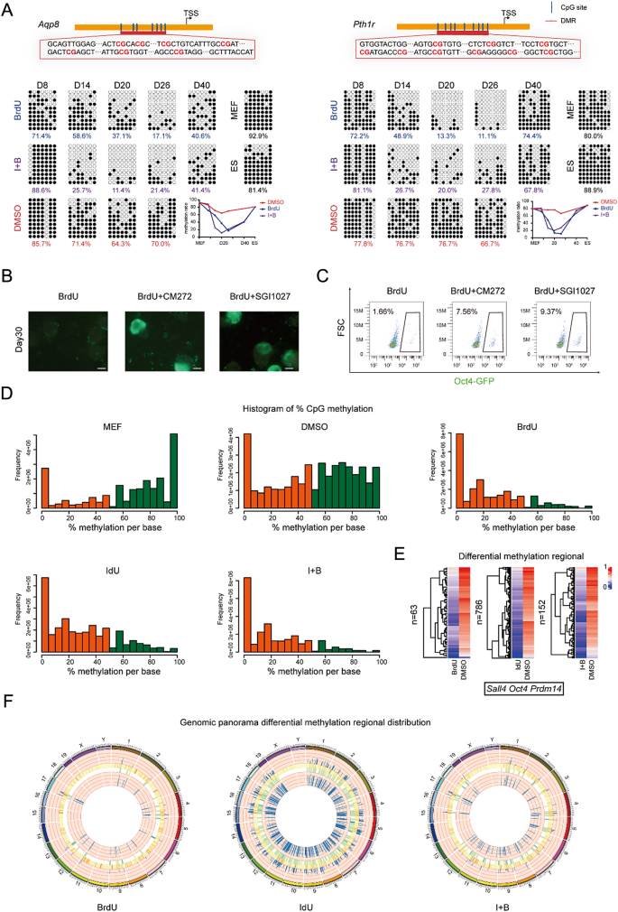 实验目的是确定BrdU/IdU克服重编程屏障的有效时间范围与剂量效应。研究采用小鼠胚胎成纤维细胞(MEFs)进行化学诱导多能干细胞(CiPSC)实验,设置不同BrdU处理时间梯度,通过检测Oct4-GFP阳性克隆形成情况评估重编程效率。结果显示,BrdU需在重编程启动后4天内开始处理,且持续处理至少6天才能有效突破重编程屏障;0-22天全程处理可使Oct4-GFP阳性克隆效率达1.2%(n=3,P<0.0001),而0-12天处理仅能获得约20个阳性克隆。同时,IdU可完全替代BrdU的功能,两者联用可进一步加速重编程进程,提高克隆纯度。