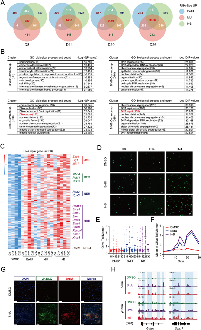 实验目的是确认BrdU/IdU诱导DNA损伤修复的核心通路。通过RNA-seq功能富集分析发现,BrdU/IdU处理组中DNA修复相关基因显著上调,其中同源重组修复(HRR)通路基因Brca1、Brca2的表达随处理时间延长持续升高;碱性彗星实验显示,BrdU处理组细胞的橄榄尾矩显著增加(n=3,P<0.05),且在重编程第14天和第24天出现两个DNA损伤峰值,与重编程屏障时间窗口完全吻合;免疫荧光实验进一步证实BrdU与DNA双链断裂标记γ-H2AX共定位,表明BrdU/IdU通过掺入基因组诱导DNA损伤,进而激活HRR通路。