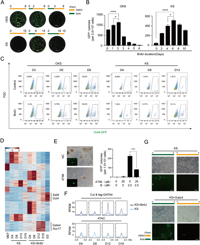γ-H2AX作为DNA双链断裂的特异性标记物,来源为重编程过程中的细胞样本,验证方法为免疫荧光共定位实验,结果显示BrdU处理组中γ-H2AX与BrdU的共定位率显著高于对照组,且在重编程第14天和第24天达到峰值(n=3,P<0.05),反映了DNA损伤的动态变化。Gata4作为XEN样状态的核心标记物,来源为细胞转录组与染色质可及性数据,验证方法为RNA-seq、Cut&tag实验与亚硫酸氢盐测序,结果显示BrdU/IdU处理后Gata4的表达水平上调5倍以上(n=3,P<0.01),其启动子区域染色质可及性提高3倍,下游基因Aqp8的甲基化水平降低40%(n=3,P<0.05),证实Gata4是介导表观遗传重塑的关键因子。