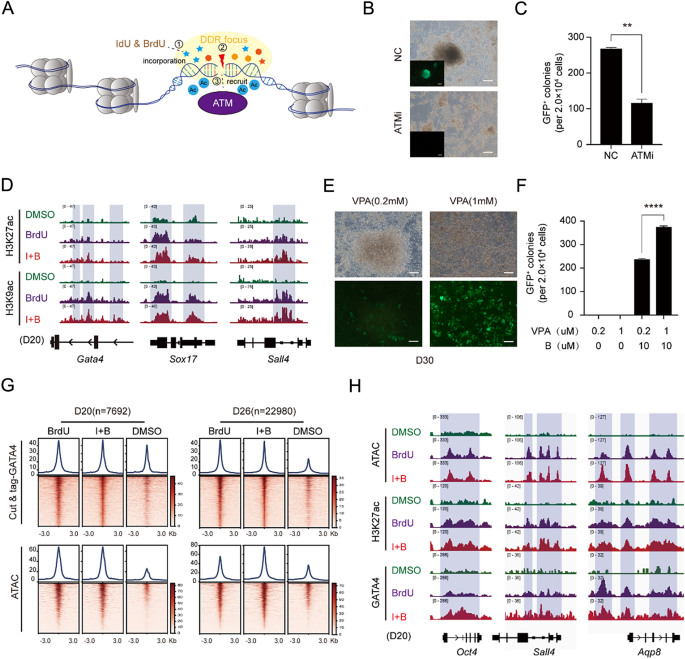 实验目的是阐明DNA损伤修复通路如何调控表观遗传修饰。研究使用ATM抑制剂KU-55933阻断DNA损伤修复通路后,BrdU无法促进重编程(n=3,P<0.01),表明ATM是介导BrdU功能的关键激酶;Cut&tag实验显示,BrdU/IdU处理可显著上调Gata4、Sox17等基因的H3K27ac、H3K9ac组蛋白乙酰化水平;全基因组甲基化分析(Gm-seq)显示,处理组细胞的CpG位点甲基化水平多集中在50%以下,而对照组则偏向50%以上,且多能性基因Sall4、Oct4的启动子区域呈现显著低甲基化状态。此外,抑制DNA甲基转移酶(DNMT)可加速重编程进程,且该效应依赖于BrdU的存在,证实DNA损伤修复通路通过组蛋白乙酰化和基因组去甲基化实现表观遗传重塑。