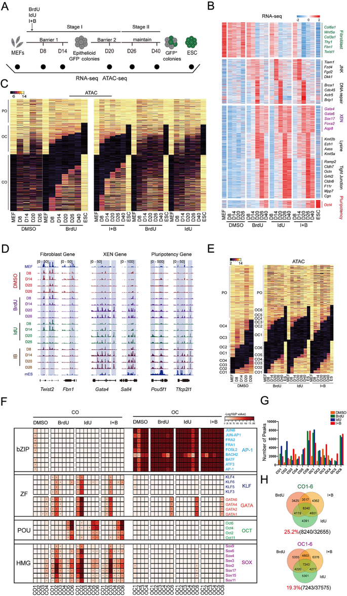 实验目的是解析BrdU/IdU调控的基因表达谱与染色质状态变化。研究对重编程不同时间点的细胞进行RNA-seq和ATAC-seq检测,结果显示,BrdU/IdU处理后,XEN样基因如Gata4、Sox17的表达随处理时间延长显著上调,且仅在胸苷类似物处理组中,XEN样基因与多能性基因(如Oct4、Tfcp2l1)的染色质区域呈现高可及性;两者联用可进一步增强染色质开放程度,加速细胞向多能态转变。生物信息学分析显示,BrdU/IdU处理可特异性激活GATA、KLF、SOX家族转录因子结合位点的染色质开放,为细胞命运转变提供了表观遗传基础。